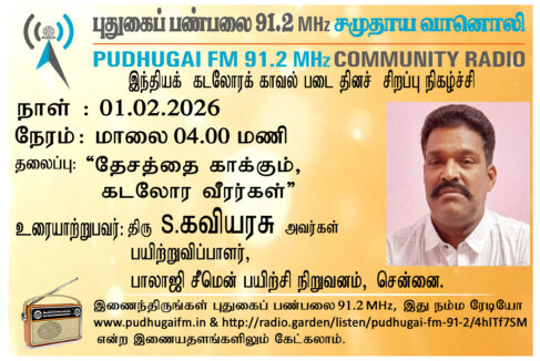 சென்னை, பாலாஜி சீமென் பயிற்சி நிறுவனம், பயிற்றுவிப்பாளர், திரு S. கவியரசு அவர்கள். “தேசத்தை காக்கும், கடலோர வீரர்கள்” என்ற தலைப்பில் வழங்கிய உரையாடல்.