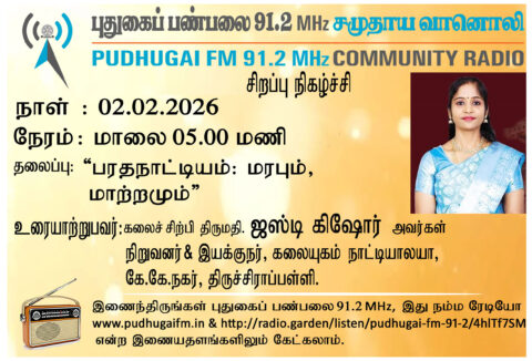 திருச்சிராப்பள்ளி கேகே நகர் கலையுகம் நாட்டியாலயா நிறுவனர் மற்றும் இயக்குனர் கலைச் சிற்பி திருமதி ஜஸ்டின் கிஷோர் அவர்கள் “பரதநாட்டியம்: மரபு, மாற்றமும்” என்ற தலைப்பில் வழங்கிய உரையாடல்.