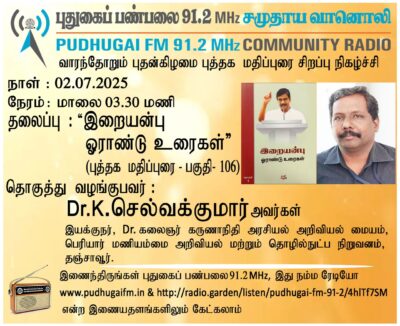 தஞ்சாவூர், பெரியார் மணியம்மை அறிவியல் மற்றும் தொழில்நுட்ப நிறுவனம், டாக்டர் கலைஞர் கருணாநிதி அரசியல் அறிவியல் மையம், இயக்குநர் Dr.K.செல்வக்குமார் அவர்கள் “(புத்தக மதிப்புரை) இறையன்பு ஓராண்டு உரைகள்” என்ற தலைப்பில் வழங்கிய உரை.