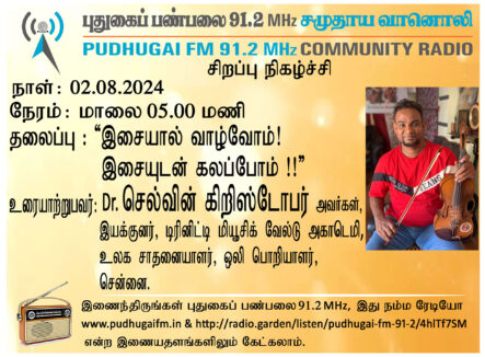 சென்னை, ஒலி பொறியாளர், உலக சாதனையாளர், டிரினிட்டி மியூசிக் வேல்டு அகாடெமி, இயக்குனர், Dr செல்வின் கிறிஸ்டோபர் அவர்கள். “இசையால் வாழ்வோம்! இசையுடன் கலப்போம்!!” என்ற தலைப்பில் வழங்கிய உரையாடல்.