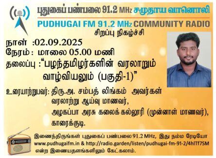காரைக்குடி, அழகப்பா அரசு கலைக்கல்லூரி, வரலாற்றுத்துறை, முன்னாள் மாணவர், திரு. அ. சம்பத் லிங்கம் அவர்கள். “பழந்தமிழர்களின் வரலாறும் வாழ்வியலும்- (பகுதி 1)” என்ற தலைப்பில் வழங்கிய உரையாடல்.