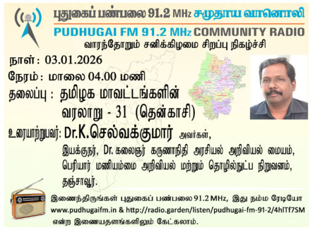 தஞ்சாவூர், பெரியார் மணியம்மை அறிவியல் மற்றும் தொழில்நுட்ப நிறுவனம், டாக்டர் கலைஞர் கருணாநிதி அரசியல் அறிவியல் மையம், இயக்குநர் Dr.K.செல்வக்குமார் அவர்கள் “தென்காசி ”என்ற தலைப்பில் வழங்கிய உரை.