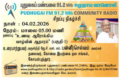 கோயம்புத்தூர், கோவை இயற்கை நல சங்கம், தலைவர், அருள்நிதி ஜே. சி. எஸ். எம். பன்னீர்செல்வம் அவர்கள். “உணவு -ஆரோக்கிய வாழ்வின் ஆதாரம்” பகுதி -01 என்ற தலைப்பில் வழங்கிய உரையாடல்.