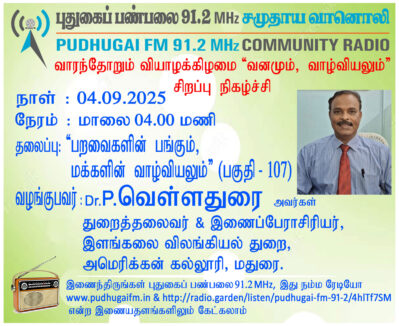— மதுரை, அமெரிக்கன் கல்லூரி, இளங்கலை விலங்கியல்துறை, துறைத்தலைவர் & இணைப்பேராசிரியர், Dr.P.வெள்ளத்துரை அவர்கள். “பறவைகளின் பங்கும், மக்களின் வாழ்வியலும்” (வனமும் வாழ்வியலும் பகுதி 107) என்ற தலைப்பில் வழங்கிய உரையாடல்.