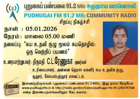 கோயம்புத்தூர் மாவட்டம், சூலூர், அன்னை தெரசா மகளிர் சுய உதவிக் குழு, உரிமையாளர், திருமதி C.L.ரேணுகா அவர்கள். “சுய உதவி குழு மூலம் சுயதொழில்: ஒரு வெற்றிப் பயணம்” என்ற தலைப்பில் வழங்கிய உரையாடல்.