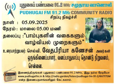சென்னை, வனப்பாதுகாப்பு தொண்டு நிறுவனம், ஒருங்கிணைப்பாளர், செல்வி. வேதபிரியா கணேசன் அவர்கள். “பாம்புகளின் வகைகளும், வாழ்வியல் முறைகளும்” என்ற தலைப்பில் வழங்கிய உரையாடல்.