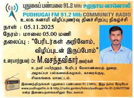 சிவகங்கை மாவட்டம், காரைக்குடி, அழகப்பா பல்கலைக்கழகம், பேரிடர் மேலாண்மைத் துறை, உதவி பயிற்றுநர், Dr.M.வசந்தவிகார் அவர்கள். “பேரிடர்கள் அறிவோம், விழிப்புடன் இருப்போம்” என்ற தலைப்பில் வழங்கிய உரையாடல்.