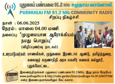 புதுக்கோட்டை, கலைஞர் கருணாநிதி அரசு மகளிர் கலைக் கல்லூரி, முதுகலை இரண்டாம் ஆண்டு, தமிழ்தத்துறை, மாணவிகள். “முழுமையான ஆரோக்கியம் நமது பொறுப்பு“ (விழிப்புணர்வு நாடகம்)