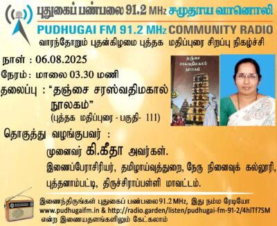 திருச்சிராப்பள்ளி மாவட்டம், புத்தனாம்பட்டி, நேரு நினைவுக் கல்லூரி, தமிழாய்வுத்துறை, இணைப்பேராசிரியர், முனைவர் கி. கீதா அவர்கள். “தஞ்சை சரஸ்வதிமகால் நூலகம்” (புத்தக மதிப்புரை பகுதி 111) என்ற தலைப்பில் வழங்கிய உரை.