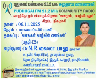 கன்னியாகுமரி மாவட்டம், நாகர்கோவில், தென் திருவிதாங்கூர், உதவிப் பேராசிரியர், Dr. N.R. லைலா பானு அவர்கள். “வனங்கள் வாழ்வின் வளங்கள்” (வனமும் ,வாழ்வியலும்- பகுதி 126) என்ற தலைப்பில் வழங்கிய உரை.