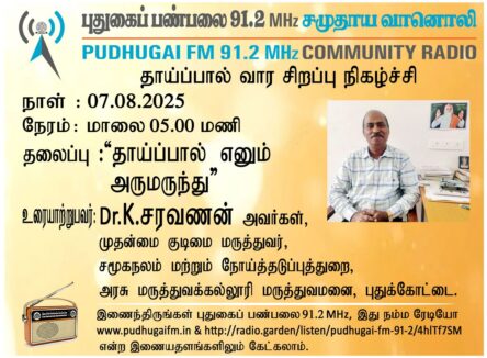 புதுக்கோட்டை, அரசு மருத்துவக்கல்லூரி மருத்துவமனை, சமூகநலம் மற்றும் நோய்த்தடுப்புத்துறை, முதன்மை குடிமை மருத்துவர், Dr.K.சரவணன் அவர்கள். “தாய்ப்பால் எனும் அருமருந்து”என்ற தலைப்பில் வழங்கிய உரையாடல்.