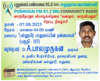 மதுரை, அமெரிக்கன் கல்லூரி, தாவரவியல் துறை, உதவிப் பேராசிரியர், Dr.A.பாலமுருகன் அவர்கள். “பல்லுயிர் பாதுகாப்பின் நன்மைகள்” வனமும் வாழ்வியலும் என்ற தலைப்பில் வழங்கிய உரை.