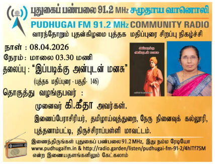 திருச்சிராப்பள்ளி மாவட்டம், புத்தனாம்பட்டி, நேரு நினைவுக் கல்லூரி, தமிழாய்வுத்துறை, இணைப்பேராசிரியர், முனைவர் கி. கீதா அவர்கள். “இப்படிக்கு அன்புடன் மனசு” (புத்தக மதிப்புரை பகுதி 146) என்ற தலைப்பில் வழங்கிய உரை.