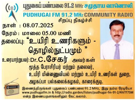 காரைக்குடி, அழகப்பா பல்கலைக்கழகம், உயிரி மின்னணுவியல் மற்றும் உயிரி உணரிகள் துறை, தலைவர் மற்றும் மூத்த பேராசிரியர், Dr.C.சேகர் அவர்கள். “உயிரி உணரிகளும்- தொழில்நுட்பமும்” என்ற தலைப்பில் வழங்கிய உரையாடல்.