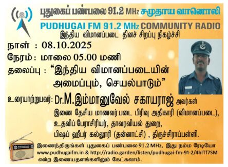 திருச்சிராப்பள்ளி, பிஷப் கீப்பர் கல்லூரி (தன்னாட்சி), தாவரவியல் துறை, உதவிப்பேராசிரியர், இணை தேசிய மாணவர் படை பிரிவு அதிகாரி (விமானப்படை) Dr.M.இம்மானுவேல் சகாயராஜ் அவர்கள். “இந்திய விமானப்படையின் அமைப்பும்,செயல்பாடும்” என்ற தலைப்பில் வழங்கிய உரையாடல்.