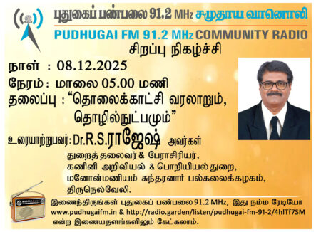 திருநெல்வேலி, மனோன்மணியம் சுந்தரனார் பல்கலைக்கழகம், கணினி அறிவியல் மற்றும் பொறியியல் துறை, துறைத்தலைவர் மற்றும் பேராசிரியர், Dr.R.S.ராஜேஷ் அவர்கள். “தொலைக்காட்சி வரலாறும் தொழில்நுட்பமும்” என்ற தலைப்பில் வழங்கிய உரையாடல்.