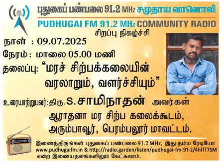 பெரம்பலூர் மாவட்டம், அரும்பாவூர், ஆராதனா மர சிற்ப கலைக்கூடம், திரு S.சுவாமிநாதன் அவர்கள். “மரச் சிற்பக் கலையின் வரலாறும், வளர்ச்சியும்” என்ற தலைப்பில் வழங்கிய உரையாடல்.