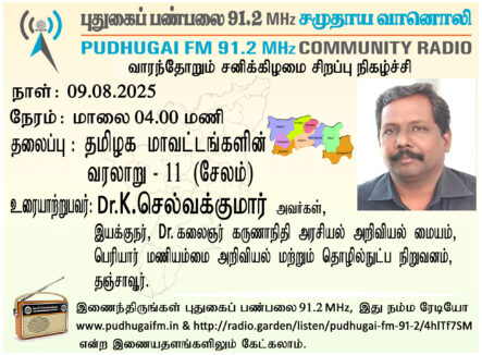 தஞ்சாவூர், பெரியார் மணியம்மை அறிவியல் மற்றும் தொழில்நுட்ப நிறுவனம், டாக்டர் கலைஞர் கருணாநிதி அரசியல் அறிவியல் மையம், இயக்குநர் Dr.K.செல்வக்குமார் அவர்கள் “தமிழக மாவட்டங்களின் வரலாறு” (சேலம்) என்ற தலைப்பில் வழங்கிய உரை.