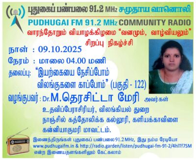 கன்னியாகுமரி மாவட்டம், களியக்காவிளை, நாஞ்சில் கத்தோலிக்க கல்லூரி, விலங்கியல் துறை, உதவிப்பேராசிரியர், Dr. M. தெரசிட்டா மேரி அவர்கள். “இயற்கையை நேசிப்போம் விலங்குகளை காப்போம்” (வனமும் வாழ்வியலும் -பகுதி 122) என்ற தலைப்பில் வழங்கிய உரை.