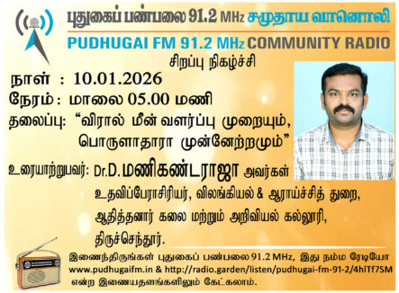 திருச்செந்தூர், ஆதித்தனார் கலை மற்றும் அறிவியல் கல்லூரி, விலங்கியல் மற்றும் ஆராய்ச்சித் துறை, உதவிப் பேராசிரியர் Dr.D. மணிகண்ட ராஜா அவர்கள். “விரால் மீன் வளர்ப்பு முறையும், பொருளாதாரா முன்னேற்றமும்” என்ற தலைப்பில் வழங்கிய உரையாடல்.