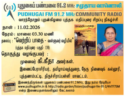 திருச்சிராப்பள்ளி மாவட்டம், புத்தனாம்பட்டி, நேரு நினைவுக் கல்லூரி, தமிழாய்வுத்துறை, இணைப்பேராசிரியர், முனைவர் கி. கீதா அவர்கள். “வெற்றிப் பாதை வள்ளுவர் வழியில்” (புத்தக மதிப்புரை பகுதி 138) என்ற தலைப்பில் வழங்கிய உரை.
