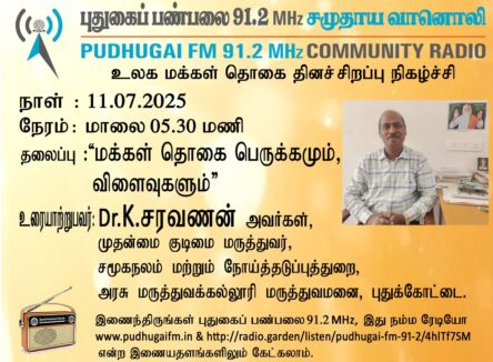 புதுக்கோட்டை, அரசு மருத்துவக்கல்லூரி மருத்துவமனை, சமூகநலம் மற்றும் நோய்த்தடுப்புத்துறை, முதன்மை குடிமை மருத்துவர், திரு Dr.K.சரவணன் அவர்கள். “மக்கள் தொகை பெருக்கமும், விளைவுகளும்” என்ற தலைப்பில் வழங்கிய உரையாடல்.