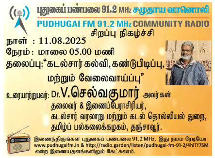 தஞ்சாவூர், தமிழ்ப் பல்கலைக்கழகம், கடல்சார் வரலாறு மற்றும் கடல் தொல்லியல் துறை, தலைவர் & இணைப்பேராசிரியர், Dr.V.செல்வகுமார் அவர்கள். “கடல்சார் கல்வி, கண்டுபிடிப்பு, மற்றும் வேலை வாய்ப்பு” என்ற தலைப்பில் வழங்கிய உரையாடல்.