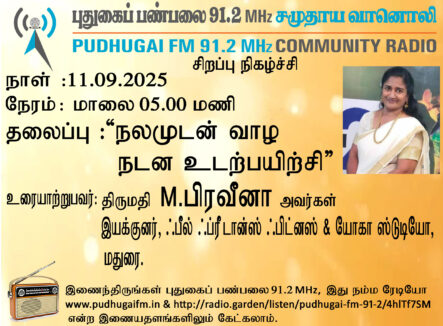 மதுரை ஃபீல் ஃப்ரீ டான்ஸ்  ஃபிட்னஸ் & யோகா ஸ்டுடியோ, இயக்குனர், திருமதி M.பிரவினா அவர்கள். “நலமுடன் வாழ நடன உடற்பயிற்சி” என்ற தலைப்பில் வழங்கிய உரையாடல்.