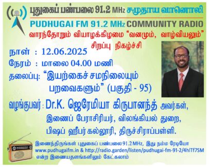 திருச்சிராப்பள்ளி, பிஷப் ஹீபர் கல்லூரி, விலங்கியல் துறை, இணைப் பேராசிரியர், Dr. K. ஜெரேமியா கிருபானந்த் அவர்கள், இயற்கைச் சமநிலையும் பறவைகளும்”(வனமும் வாழ்வியலும்95) என்ற தலைப்பில் வழங்கிய உரை.