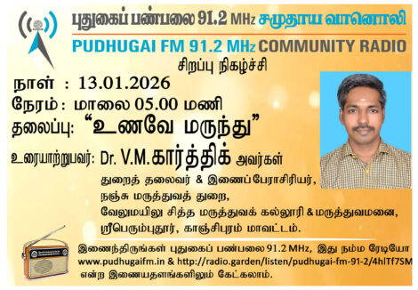 காஞ்சிபுரம் மாவட்டம், ஶ்ரீபெரும்புதூர், வேலுமயிலு சித்த மருத்துவக் கல்லூரி மற்றும் மருத்துவமனை, துறைத் தலைவர் மற்றும் இணைப்பேராசிரியர், நஞ்சு மருத்துவத் துறை, Dr.V.M. கார்த்திக் அவர்கள். “உணவே மருந்து” என்ற தலைப்பில் வழங்கிய உரையாடல்.