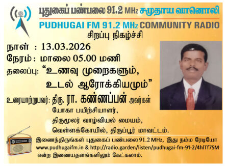 திருப்பூர் மாவட்டம், வெள்ளகோயில், திருமூலர் வாழ்வியல் மையம், யோகா பயிற்சியாளர், திரு. ரா. கண்ணப்பன் அவர்கள். “உணவு முறைகளும், உடல் ஆரோக்கியமும்” என்ற தலைப்பில் வழங்கிய உரையாடல்.