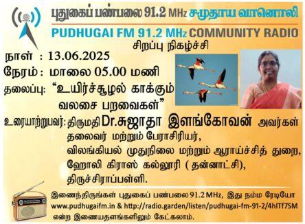 திருச்சிராப்பள்ளி, ஹோலி கிராஸ் கல்லூரி, விலங்கியல் முதுநிலை மற்றும் ஆராய்ச்சித் துறை, தலைவர் மற்றும் பேராசிரியர், திருமதி Dr.சுஜாதா இளங்கோவன் அவர்கள். “உயிர்ச்சூழல் காக்கும் வலசை பறவைகள்” என்ற தலைப்பில் வழங்கிய உரையாடல்.