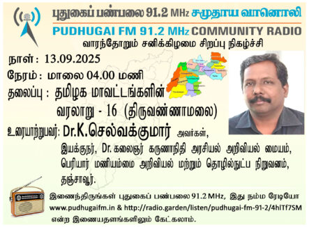 தஞ்சாவூர், பெரியார் மணியம்மை அறிவியல் மற்றும் தொழில்நுட்ப நிறுவனம், டாக்டர் கலைஞர் கருணாநிதி அரசியல் அறிவியல் மையம், இயக்குநர் Dr.K.செல்வக்குமார் அவர்கள் “தமிழக மாவட்டங்களின் வரலாறு” (திருவண்ணாமலை) என்ற தலைப்பில் வழங்கிய உரை.