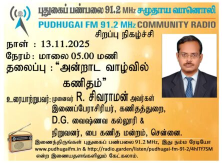 சென்னை, பை கணித மன்றம், நிறுவனர் & D.G வைஷ்ணவ கல்லூரி, கணிதத்துறை, இணைப்பேராசிரியர், முனைவர் R. சிவராமன் அவர்கள். “அன்றாட வாழ்வில் கணிதம்” என்ற தலைப்பில் வழங்கிய உரையாடல்.