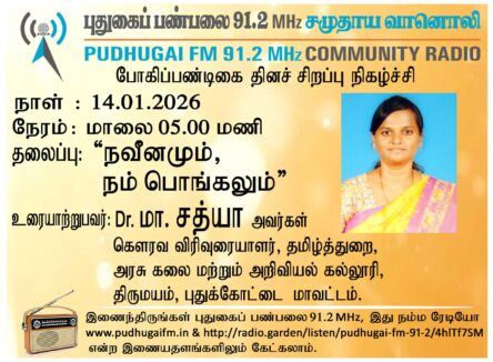 புதுக்கோட்டை மாவட்டம், திருமயம், அரசுக் கலை மற்றும் அறிவியல் கல்லூரி, தமிழ்த்துறை, கௌரவ விரிவுரையாளர், Dr.மா. சத்யா அவர்கள். “நவீனமும், நம் பொங்கலும்” என்ற தலைப்பில் வழங்கிய உரையாடல்.