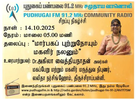 திருச்சிராப்பள்ளி, லலிதா நர்சிங்ஹோம், மகப்பேறு மற்றும் மகளிர் மருத்துவ நிபுணர், Dr.அகிலா வைத்தியநாதன் அவர்கள். “மார்பகப் புற்றுநோயும் மகளிர் நலனும்” என்ற தலைப்பில் வழங்கிய உரையாடல்.