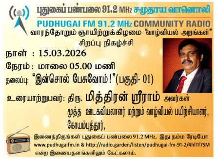 கோயம்புத்தூர், மூத்த  ஊடகவியலாளர் மற்றும் வாழ்வியல் பயிற்சியாளர், திரு. மித்திரன் ஸ்ரீராம் அவர்கள். “வாழ்வியல் அறங்கள் – இன்சொல் பேசுவோம்! (பகுதி 01)” என்ற தலைப்பில் வழங்கிய உரை.