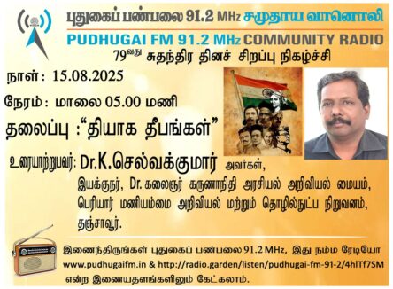 தஞ்சாவூர், பெரியார் மணியம்மை அறிவியல் மற்றும் தொழில்நுட்ப நிறுவனம், டாக்டர் கலைஞர் கருணாநிதி அரசியல் அறிவியல் மையம், இயக்குநர் Dr.K.செல்வக்குமார் அவர்கள். “தியாக தீபங்கள்” என்ற தலைப்பில் வழங்கிய உரையாடல்.