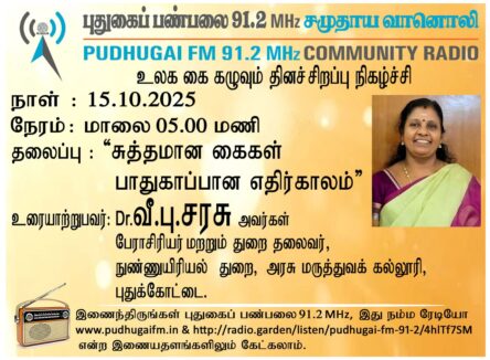 புதுக்கோட்டை ,அரசு மருத்துவக் கல்லூரி, நுண்ணுயிரிகள் துறை, பேராசிரியர் மற்றும் துறை தலைவர், Dr. வீ.பு சரசு அவர்கள். “சுத்தமான கைகள் பாதுகாப்பான எதிர்காலம்” என்ற தலைப்பில் வழங்கிய உரையாடல்.