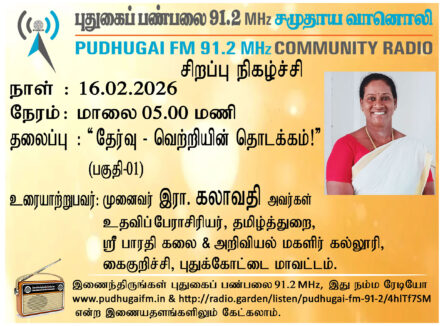 புதுக்கோட்டை மாவட்டம், கைகுறிச்சி, ஸ்ரீ பாரதி கலை மற்றும் அறிவியல் மகளிர் கல்லூரி, தமிழ்த்துறை, உதவிப்பேராசிரியர், முனைவர் இரா. கலாவதி அவர்கள். “தேர்வு வெற்றியின் தொடக்கம்! “(பகுதி -01) என்ற தலைப்பில் வழங்கிய உரையாடல்.