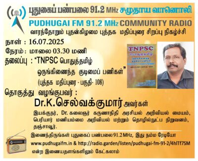 தஞ்சாவூர், பெரியார் மணியம்மை அறிவியல் மற்றும் தொழில்நுட்ப நிறுவனம், டாக்டர் கலைஞர் கருணாநிதி அரசியல் அறிவியல் மையம், இயக்குநர் Dr.K.செல்வக்குமார் அவர்கள் (புத்தக மதிப்புரை) “TNPSC பொதுத்தமிழ் ஒருங்கிணைந்த குடிமைப் பணிகள்” என்ற தலைப்பில் வழங்கிய உரை.