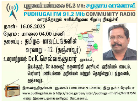 தஞ்சாவூர், பெரியார் மணியம்மை அறிவியல் மற்றும் தொழில்நுட்ப நிறுவனம், டாக்டர் கலைஞர் கருணாநிதி அரசியல் அறிவியல் மையம், இயக்குநர் Dr.K.செல்வக்குமார் அவர்கள் “தமிழக மாவட்டங்களின் வரலாறு” (தஞ்சாவூர்) என்ற தலைப்பில் வழங்கிய உரை.