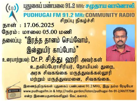 சிவகங்கை, அரசு சிவகங்கை மருத்துவக்கல்லூரி மற்றும் மருத்துவமனை, நோயியல் துறை உதவிப்பேராசிரியர், Dr.P.சித்து ஹரி அவர்கள். “இரத்த தானம் செய்வோம் இன்னுயிர் காப்போம்” என்ற தலைப்பில் வழங்கிய உரையாடல்.