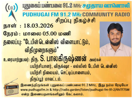 திருப்பூர் மாவட்டம், செட்டிப்பாளையம், விருக்க்ஷா எல்லிஸ் டேபிள் டென்னிஸ் பயிற்சி நிலையம், பயிற்சியாளர், திரு .S.பாலகிருஷ்ணன் அவர்கள். “டேபிள் டென்னிஸ் விளையாட்டு, விதிமுறைகளும்” என்ற தலைப்பில் வழங்கிய உரையாடல்.