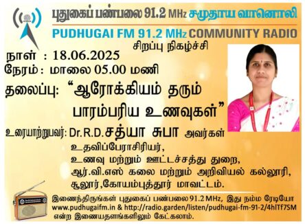 கோயம்புத்தூர் மாவட்டம், சூலூர், ஆர். வி. எஸ் கலை மற்றும் அறிவியல் கல்லூரி உணவு மற்றும் ஊட்டச்சத்து துறை, உதவிப்பேராசிரியர், Dr. R.D. சத்யா சுபா அவர்கள். “ஆரோக்கியம் தரும் பாரம்பரிய உணவுகள்” என்ற தலைப்பில் வழங்கிய உரையாடல்.**********