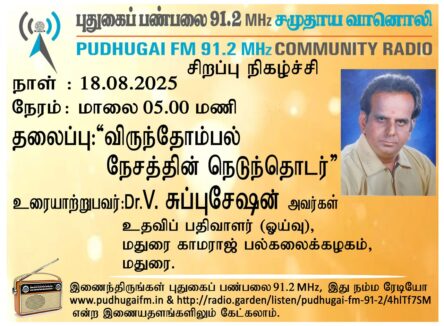 மதுரை, மதுரை காமராஜ் பல்கலைக்கழகம், உதவிப் பதிவாளர் (ஓய்வு), Dr. V. சுப்புசேஷன் அவர்கள். “விருந்தோம்பல் நேசத்தின் நெடுந்தொடர்” என்ற தலைப்பில் வழங்கிய உரையாடல்.