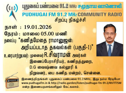சென்னை, பை கணித மன்றம், நிறுவனர் & D.G வைஷ்ணவ கல்லூரி, கணிதத்துறை, இணைப்பேராசிரியர், முனைவர் R. சிவராமன் அவர்கள். “கணிதமேதை ராமானுஜன்: அறியப்படாத உண்மைகள்- பகுதி -01” என்ற தலைப்பில் வழங்கிய உரையாடல்.