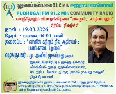 திருச்சிராப்பள்ளி, ஜமால் முகமது கல்லூரி, பாடத்திட்ட மேம்பாட்டு குழு, ஒருங்கிணைப்பாளர், விலங்கியல் துறை, துறைத்தலைவர் மற்றும் இணைப்பேராசிரியர், மு. அனீஸ் முகம்மது அவர்கள். “வானில் சுற்றும் நீல அதிசயம்: பனங்காடை பறவை” (வனமும் வாழ்வியலும்-பகுதி-144) என்ற தலைப்பில் வழங்கிய உரை.