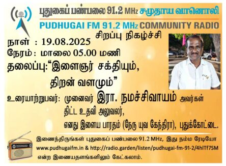 புதுக்கோட்டை, எனது இளைய பாரதம் நேரு யுவ கேந்திரா, திட்ட உதவி அலுவலர், முனைவர் இரா. நமச்சிவாயம் அவர்கள். “இளைஞர் சக்தியும் திறன் வளமும்” என்ற தலைப்பில் வழங்கிய உரையாடல்.