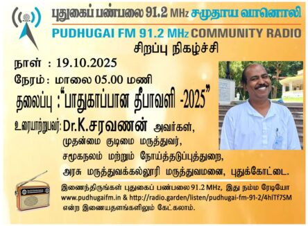 புதுக்கோட்டை, அரசு மருத்துவக்கல்லூரி மருத்துவமனை, சமூகநலம் மற்றும் நோய்த்தடுப்புத்துறை, முதன்மை குடிமை மருத்துவர், Dr.K.சரவணன் அவர்கள். “பாதுகாப்பான தீபாவளி”என்ற தலைப்பில் வழங்கிய உரையாடல்.